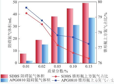 表面活性劑泡沫對氮氣緩釋作用結果如圖11所示。相同質量分數下,SDBS溶液對氮氣的緩釋效應優于APG0810,質量分數為0.15%時,SDBS和APG0810溶液泡沫阻礙氮氣體積分別為49.102 mL和37.042 mL。