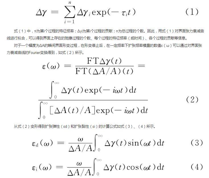 本研究中采用界面張力弛豫法,通過對受擾動界面張力衰減曲線擬合獲得界面張力改變量隨時間變化的函數關系,再經過Fourier變換,計算得到界面擴張參數的全頻率譜,從而獲得界面上活性分子行為的信息。
