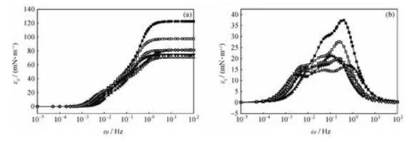 圖5含不同量酸性組分的煤油-1750mg/L HMPAM水溶液體系的界面擴張彈性(εd)和擴張黏性(εi)全頻率譜