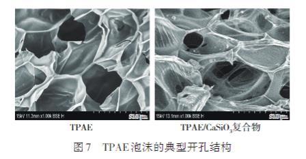 根據TPAE/無機粒子復合物泡沫的泡孔結構圖可以看出,相比較于純TPAE泡沫的閉孔結構,無機粒子的添加明顯促進了TPAE泡沫泡孔的打開。為詳細探究無機粒子的開孔機制,使用真密度儀對不同TPAE/無機粒子復合物泡沫的開孔率進行了測試,如圖6所示。無機粒子的添加都提高了TPAE泡沫的開孔率,表明無機粒子的加入是影響開孔率的關鍵因素。基于TPAE和TPAE/CaSiO3復合物泡沫中的開孔結構分析無機粒子對復合物泡沫開孔結構的影響(以CaSiO3為例),如圖7所示??梢钥闯?,純TPAE泡沫主要出現泡孔壁上,且形成的孔比較規則,這是由于純TPAE熔體強度低,泡孔壁容易破裂。而TPAE/CaSiO3復合物泡沫的開孔主要發生在泡孔的內壁以及幾個泡孔的相交處上,這是因為在泡孔生長過程中,由于CaSiO3的非均相成核,泡孔在CaSiO3分散相周圍成核生長,形成花狀的泡孔結構,而TPAE與無機粒子的相容性差,使得CaSiO3從泡孔壁上脫落,留下不規則的網狀結構,從而導致泡孔間相互連接。其他3種TPAE/無機粒子復合物泡沫的開孔形式同TPAE/CaSiO3復合物泡沫一致。圖8展示了兩種與TPAE具有不同界面張力的粒子(以CaSiO3和Talc為例)的添加對復合物泡沫開孔結構形成的影響機制。