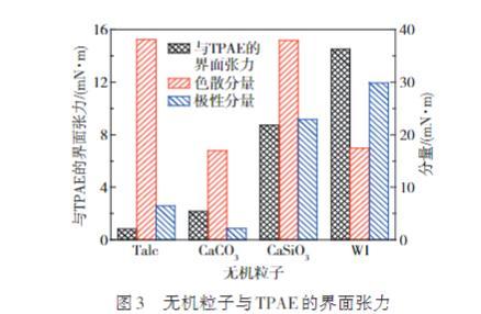 相比之下,CaSiO3與TPAE、WI與TPAE的界面張力分別達到8.72 mN/m和14.5 mN/m,大約為Talc的10~15倍,高界面張力通常導致物質間的相分離,表明CaSiO3和WI與TPAE之間存在明顯的不相容。而CaCO3與TPAE的界面張力雖低于CaSiO3和WI,但仍高于Talc,表明CaCO3與TPAE的相容性位于中間。