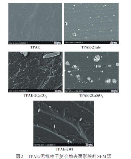 對比之下,含有CaSiO3、CaCO3、WI無機粒子的TPAE復合材料展示出典型的兩相形態,這些粒子在TPAE基體中的均勻分散揭示了TPAE與這3種無機粒子之間在熱力學上的不相容性。值得注意的是,相比較于TPAE-2CaCO3和TPAE-2WI,TPAE-2CaSiO3復合材料的斷面形貌中的CaSiO3粒子表現出明顯的團聚現象,這可歸因于CaSiO3獨特的多孔蜂窩狀結構,使得在含量增加時,粒子間相互碰撞并傾向于結合,容易形成更大的聚集體,使得CaSiO3粒子尺寸顯著大于其他兩種無機粒子。