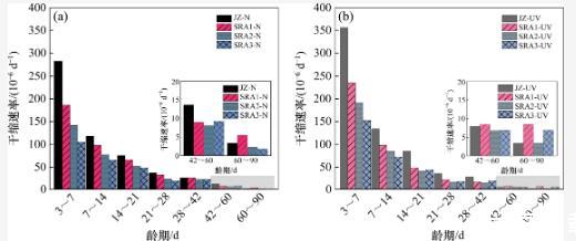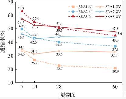 從圖3中可以觀察到,隨著齡期的延長,干縮曲線SRA2-UV逐漸接近于干縮曲線SRA3-UV,而SRA3-UV的干縮值沒有進一步降低。這表明上述分析是合理的。在強紫外線輻射下,當減縮劑的摻量超過3%時,其孔隙溶液中的SRA濃度超過臨界濃度(CMC),進一步增大摻量不能增強SRA在該應用環(huán)境中的減縮效果。