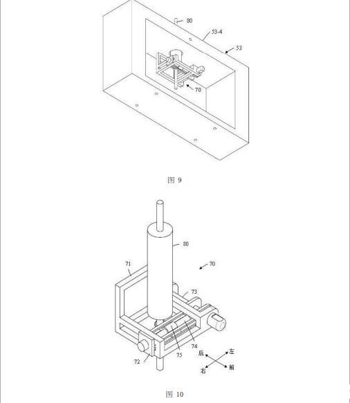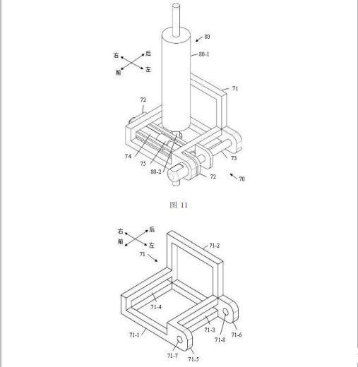 如圖10和圖11所示,注射器調節組件70包括固定座71、滑動座72、第二絲桿73、第三絲桿74、以及第二螺母件75。