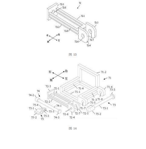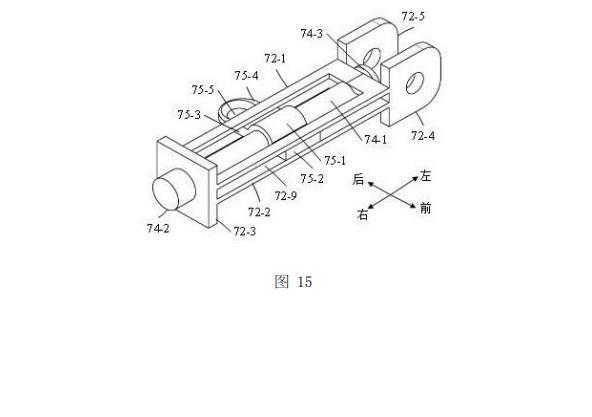 如圖13所示,滑動座72包括第一U形板72-1、第二U形板72-2、蓋形板72-3、第一尾板72-4、以及第二尾板72-5。第一U形板72-1和第二U形板72-2的開口端都與蓋形板72-3的左側面(即里側面)固定連接,并且第一U形板72-1和第二U形板72-2均與蓋形板72-3相垂直,其中蓋形板72-3沿豎直方向延伸且蓋形板72-3上設置有通孔72-8,第一U形板72-1和第二U形板72-2均沿水平方向延伸;第一U形板72-1位于第二U形板72-2的上方,第一U形板72-1與第二U形板72-2相互平行且二者之間設置有一個縫隙72-9。在本實施例中,第一U形板72-1與第二U形板72-2相同。