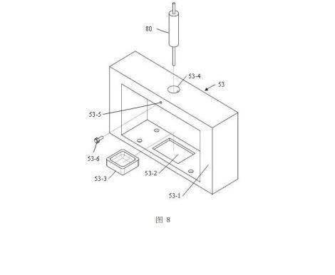 如圖8所示,第三窗形件53的第三邊框部53-1的下邊框上設置有一個例如長方形的凹坑53-2,并且沿左右方向凹坑53-2位于第三邊框部53-1的中間位置,凹坑53-2內設置有一個積液盆53-3。第三窗形件53的第三邊框部53-1的上邊框上設置有一個例如圓形的第三通孔53-4,第三通孔53-4沿豎直方向延伸,并且第三通孔53-4位于凹坑53-2的正上方;注射器80包括主體管80-1和固定設置于主體管80-1下端面的針管80-2,主體管80-1和針管80-2均為內部中空的圓形管,并且針管80-2的直徑小于主體管80-1的直徑,針管80-2與主體管80-1的內部空腔相連通;注射器80的主體管80-1固定設置于第三通孔53-4內,并且針管80-2的末端剛好與攝像機61的中心軸線(即光源62的中心軸線)相交。在本實施例中,第三窗形件53的第三邊框部53-1的上邊框的側面設置有一個沿前后方向延伸的第一螺紋孔53-5,并且第一螺紋孔53-5與第三通孔53-4相連通;螺栓53-6設置于第一螺紋孔53-5內,螺栓53-6的外螺紋能夠與第一螺紋孔53-5相嚙合,并且螺栓53-6的里端能夠與注射器80的主體管80-1外壁相抵接,從而使得注射器80的主體管80-1固定設置于第三通孔53-4內。