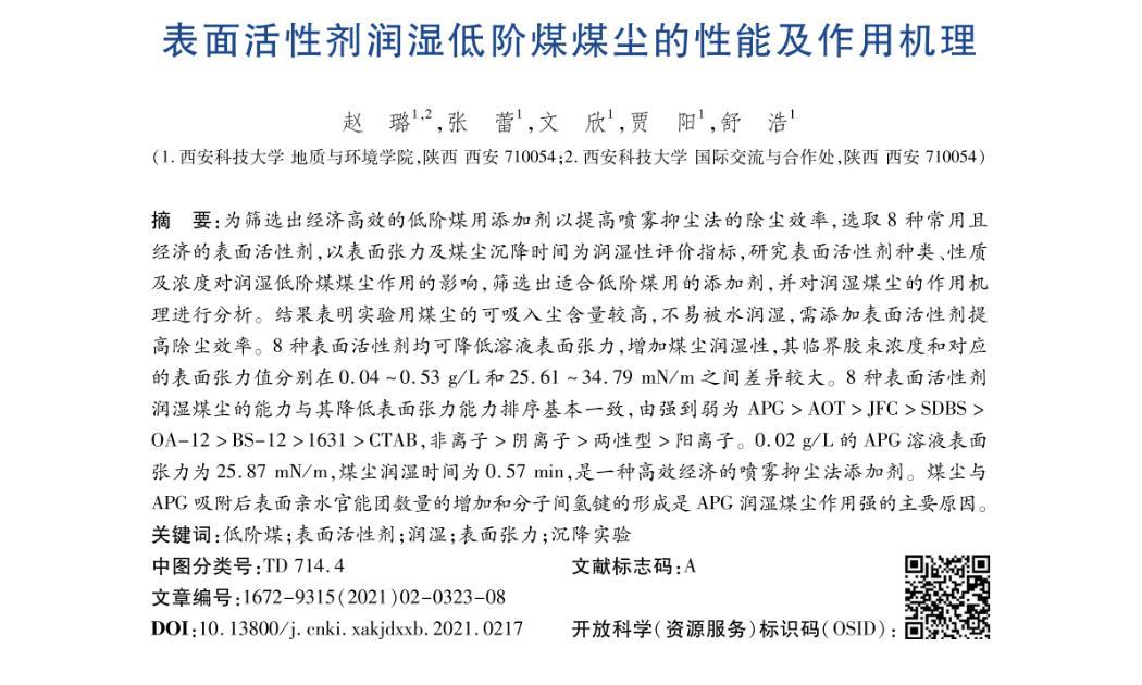 低階煤在中國儲量豐富且富含高附加值油氣資源,可以高效分質(zhì)利用,為緩解我國石油資源緊張和環(huán)境污染局面提供了新的可能,逐漸成為新的關(guān)注點。近年來隨著低階煤開采量的增大,采煤機械化程度的提高,全機械化工作面上的煤塵濃度可達3 000 mg/m3,遠超國家職業(yè)衛(wèi)生標準中的要求。長時間暴露于超標的煤塵環(huán)境是礦工患塵肺病的重要誘因之一。塵肺病發(fā)病率高且無法治愈,2018年,全國報告的職業(yè)性塵肺病19 468例,占到了各類職業(yè)病新病例總數(shù)的8285%,且發(fā)生率還有上升趨勢。此外,井下煤塵濃度聚集到一定程度還會引發(fā)爆炸,造成更大的人員傷亡和經(jīng)濟損失。因此,有效抑制礦塵對煤礦安全生產(chǎn)和礦工的職業(yè)健康安全都至關(guān)重要。目前常用的措施包括通風除塵、煤層注水、噴霧灑水等,這些技術(shù)對降低作業(yè)點的粉塵濃度都起到了重要作用。低階煤的煤化程度較低、揮發(fā)分及灰分含量高、含水率高、含氧多、孔結(jié)構(gòu)豐富,與其他煤種相比通常更易被潤濕,因此適用噴霧抑塵。噴灑自來水的除塵效率只有不到60%,向水中加入表面活性劑可以增加煤塵潤濕性和滲透性,提高除塵效率。化學表面活性劑的選擇受自身性質(zhì)、結(jié)構(gòu)、煤塵表面官能團、煤塵帶電性質(zhì)等多種因素的影響,其選擇具有特異性和專一性,目前關(guān)于抑制低階煤煤塵添加劑的研究還較少。篩選出常用且經(jīng)濟的表面活性劑作為添加劑提高低階煤煤塵的除塵效率具有積極意義。