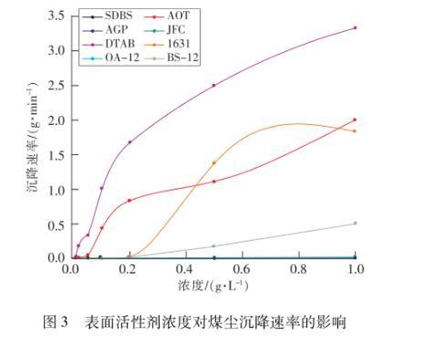 由表4和圖3可以看到,當濃度為0.1 g/L時,煤塵在AOT和APG溶液中的沉降時間不到1 min,而在陽離子和兩性型表面活性劑溶液中的沉降時間超過1 h。在同一濃度下,煤塵在不同表面活性劑溶液中的沉降時間相差較大,表面活性劑自身性質影響潤濕煤塵的作用。當濃度增大到各表面活性劑的臨界膠束濃度附近時,煤塵在陰離子和非離子表面活性劑中的沉降時間會急劇下降,縮短至5 min之內,但在陽離子和兩性型表面活性劑中沉降時間依然大于1 h。總體而言,8種表面活性劑潤濕煤塵的能力由強到弱依次排序為:APG>AOT>JFC>SDBS>OA-12>BS-12>1631>CTAB,這與表面活性劑降低表面張力的能力排序基本一致。陽離子表面活性劑潤濕煤塵效果最差,主要是因為親水頭基的正電荷與煤塵所帶負電荷之間的靜電力大于疏水基團之間的范德華力,形成了親水基團朝向煤塵表面、疏水基團朝向水的單分子膜,不利于潤濕。APG潤濕煤塵效果最好主要與其自身結構有關,APG分子結構碳原子上的醇羥基與水分子之間存在強烈相互作用,間接弱化了烷基糖苷分子結構中親水基團與煙煤表面含氧親水官能團之間的吸附作用,更有利于疏水基團與煤塵表面的疏水基團發生強烈相互作用,以親水頭基伸向溶液,疏水尾部吸附在煤塵上的方式排列,降低了溶液及固-液界面張力,增加了煤塵親水性。APG濃度達到0.02 g/L時,煤塵沉降時間僅為057 min,沉降速率為0.18 g/min,潤濕煤塵效果良好,當濃度繼續增大,潤濕煤塵作用變化不大,綜合考慮成本及效率后,選擇濃度為0.02 g/L的APG作為低階煤用噴霧抑塵法的添加劑。