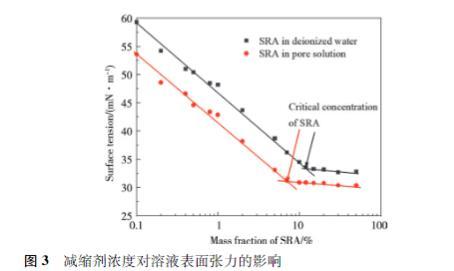 由圖3還可知,SRA在去離子水中混合時,臨界SRA濃度約為11.2%,當SRA在合成孔溶液中混合時,臨界SRA濃度約為7.3%.這意味著溶液中的離子會使得臨界SRA濃度降低。對于混凝土,實際的內部離子濃度更高,而臨界SRA濃度取決于孔隙溶液的離子組成,因此,實際的臨界SRA濃度更低。
