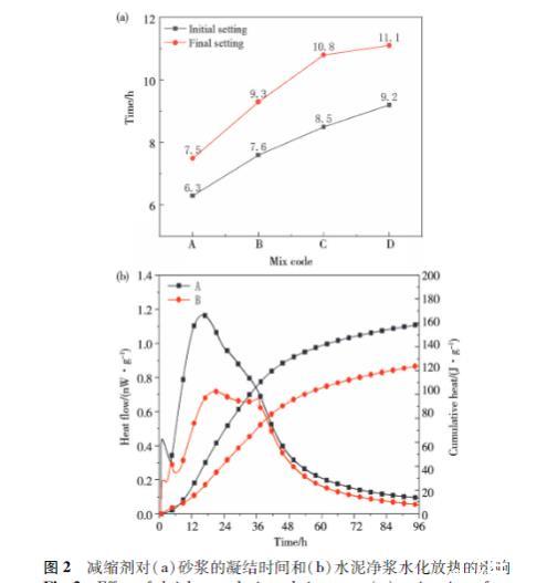 圖2減縮劑對(a)砂漿的凝結時間和(b)水泥凈漿水化放熱的影響