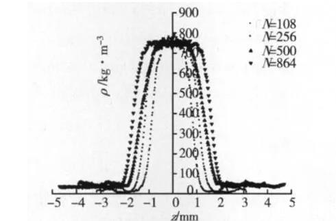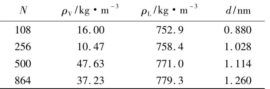 在溫度500 K和截斷半徑rc=0.9498 nm的條件下,當(dāng)模擬分子數(shù)N=108、256、500和864時,模擬得到的密度分布見圖9。統(tǒng)計得到的汽相主體密度ρV、液相主體密度ρL及汽液界面厚度d見表5。