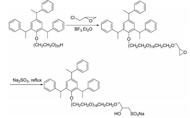 采用“一鍋煮”法制備表面活性劑,合成路線如圖1所示。將一個帶有機(jī)械攪拌器,回流冷凝管和恒壓滴液漏斗的500 mL三頸瓶置于80℃的恒溫水浴中,先后加入92 g的三苯乙烯苯酚聚氧乙烯醚-25和75 mL的正庚烷,向攪拌后形成的溶液中加入2 mL的三氟化硼乙醚催化劑,用恒壓滴液漏斗滴加過量的環(huán)氧氯丙烷溶液,滴加完后升溫至90℃反應(yīng)3 h;然后滴加20%NaOH水溶液,維持反應(yīng)體系的pH值在7.5~9,TLC監(jiān)測反應(yīng)進(jìn)程到原料點(diǎn)消失后結(jié)束反應(yīng)。向產(chǎn)物中加入二甲亞砜,溶解后過濾除去反應(yīng)中生成的鹽;用正庚烷萃取、水洗后旋轉(zhuǎn)蒸發(fā)除去溶劑;將粗產(chǎn)物溶解于乙醇中,向其中滴加100 mL的25%的亞硫酸鈉溶液,分批加入6 mol/L的鹽酸溶液維持反應(yīng)體系的pH值在7~9,在80℃的恒溫水浴中繼續(xù)反應(yīng)過夜,將反應(yīng)物用熱的異丙醇萃取后過濾除去無機(jī)鹽,將濾液旋轉(zhuǎn)蒸發(fā)除去溶劑得到黃色產(chǎn)物三苯乙烯基聚氧乙烯醚羥丙基磺酸鈉,即為表面活性劑TPHS。