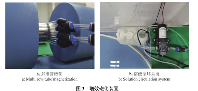 由于靜態磁化單次最多磁化50 mL溶液,而單次噴霧霧滴粒徑測試過程使用溶液量為1 L左右,因此,所有試驗組使用的溶液均參照常規方式以一定流速通過磁場進行磁化。為增加磁化效果,使用多排管和循環磁化方式對溶液進行增效磁化,為避免霧滴粒徑測試過程中出現溶液量不足的現象,設定單次循環磁化溶液量為3 L,增效磁化裝置如圖3所示。磁化除草劑霧滴粒徑試驗設計同表1,循環磁化時長與靜態磁化時長對應一致,對照組與試驗組共48組試驗。處理1不進行磁化處理,用霧滴粒徑儀重復測3次取平均值,為122.47μm,當作對照值,試驗中以體積中值直徑(Volume median diameter,VMD)表示霧滴直徑。處理2設置磁場強度為50 mT,循環磁化完畢后立即用激光粒度儀測磁化后溶液噴霧霧滴粒徑并記錄數據。之后每個處理磁場強度遞增50 mT,操作步驟參照處理2進行。磁化溶液霧滴粒徑測試系統如圖4所示。