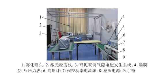 噴施壓力是影響噴霧霧滴粒徑的關鍵因素,試驗中通過手動調整隔膜泵調壓螺絲,設定噴施壓力為0.3 MPa,使用穩壓電源供給隔膜泵穩定的12 V額定工作電壓,確保所有試驗組噴施壓力一致;扇形噴面不同位置的霧滴粒徑也有較大差別,所有試驗組霧滴粒徑測試點設定為扇形噴面對稱中心線上距離噴頭40 cm處。試驗環境溫度保持為26℃,噴施系統管長(磁極至霧化噴頭水管長度)設為1 m,按照除草劑與自來水1∶300的體積比配置試驗溶液。