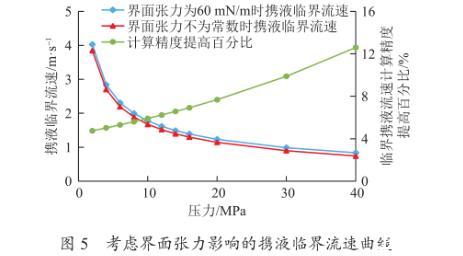 (1)界面張力對攜液臨界流量影響。如圖5所示為氣體相對密度為0.7,溫度為100℃時,利用新模型計算當(dāng)界面張力為常數(shù)(60 mN/m)和界面張力隨壓力變化時不同壓力下的攜液臨界流速。考慮界面張力變化的攜液臨界流速要比界面張力為常數(shù)時的小,計算精度更高。且隨著壓力的增大,攜液臨界流速的計算精度提高百分比,逐漸從4%上升至12.5%,平均提高了8%。