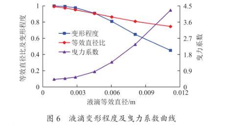 (2)液滴尺寸和液滴變形。如圖6所示為壓力15 MPa,溫度50℃時不同液滴尺寸下液滴變形程度、曳力系數(shù)的變化趨勢。從中可知,當(dāng)液滴特別小時(1 mm),等效直徑比及變形程度系數(shù)接近1,曳力系數(shù)近似0.44,液滴呈球形基本不發(fā)生變形;隨著液滴尺寸從1 mm增大到10 mm時,等效直徑比從1減小到0.75,變形程度系數(shù)從1減小到0.45,曳力系數(shù)從0.44增大到4.3,液滴呈橢球形變形程度逐漸加大。