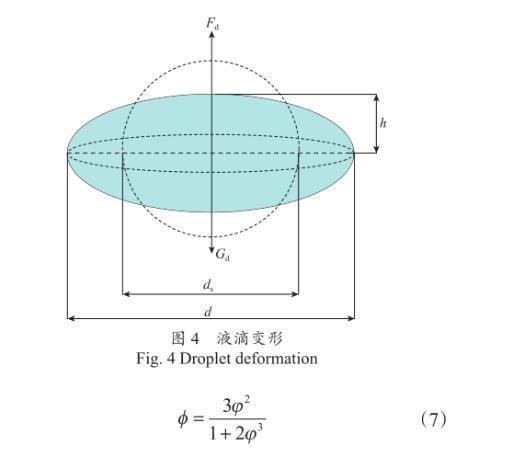 如圖4所示,ds為球形液滴的直徑,m;d為液滴變形后迎風(fēng)面直徑,m;h為橢球體短軸高度,m。液滴等效直徑比φ為球形液滴直徑與變形后迎風(fēng)面直徑比,即φ=ds/d。當(dāng)液滴為橢球形時,其表面積近似為