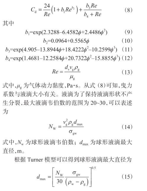 式中,φ為液滴變形程度系數(shù),為與變形液滴體積相等的等效球形表面積與實(shí)際液滴表面積的比值。當(dāng)氣液相對速度不大時,液滴保持球形,可以利用球形液滴曳力系數(shù)計算攜液臨界流量,但是當(dāng)液滴發(fā)生變形以后,曳力系數(shù)和液滴迎風(fēng)面積相應(yīng)的發(fā)生改變,用球形液滴曳力系數(shù)計算誤差可能高達(dá)30%,對于非球形剛性顆粒,可以應(yīng)用如下曳力系數(shù)表達(dá)式進(jìn)行計算: