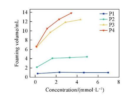 圖6示出4種表面活性劑泡沫穩(wěn)定性隨濃度的變化情況。泡沫穩(wěn)定性隨著濃度的增加先升高至最大值后又降低。這是因為表面活性劑的吸附導(dǎo)致了Gibbs-Marangoni效應(yīng)。當(dāng)液膜受到?jīng)_擊局部變薄時,產(chǎn)生表面張力梯度,導(dǎo)致鄰近區(qū)域吸附的表面活性劑攜帶水化層向薄膜處遷移,以恢復(fù)原來的表面張力并修復(fù)液膜。在較低濃度時,表面活性劑濃度的增加使得Gibbs-Marangoni效應(yīng)隨之加強,進而有效阻止液膜變薄,增加泡沫的穩(wěn)定性。當(dāng)濃度大于cmc后,溶液中的表面活性劑分子能夠快速吸附在界面處,使得Gibbs-Marangoni效應(yīng)減弱,泡沫穩(wěn)定性降低。在4種表面活性劑中,P2的泡沫穩(wěn)定性最強,這可能是由于分子在空氣/水界面上排列最緊密,形成的液膜強度更大,因此泡沫不易發(fā)生破裂。