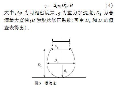 Jyoti等使用軸對稱液滴形狀分析法(axisymmetricdropshapeanalysis,ADSA)研究單層壓縮速率對表面張力?表面積等溫線形狀的影響。懸滴法(見圖5)可認為是ADSA的雛形,其通過Laplace方程應(yīng)用于液滴輪廓來確定懸垂液滴的表面張力和接觸角,懸滴法實質(zhì)上是滴外形法的一種。滴外形法的基本原理是:當(dāng)液滴在管口形成時,液滴形狀與表面張力存在一定的關(guān)系。懸滴法測量表面張力可由下列公式計算:γ=ΔρgD2E/H(4)式中:Δρ為兩相密度差;g為重力加速度;DE為懸滴最大直徑;H為形狀修正系數(shù)(可由DE和DS的值查表得出)。