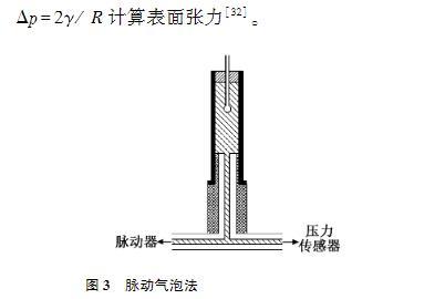 脈動氣泡法測量裝置如圖3所示。待測試液置于小體積的樣品室中,樣品室通過垂直毛細管與環(huán)境空氣連通。脈動器活塞的運動在腔室中產(chǎn)生負壓,導(dǎo)致空氣被吸入毛細管形成氣泡。當(dāng)活塞來回移動時,氣泡會產(chǎn)生脈動,從而模擬呼吸動力學(xué)。通過脈動器的預(yù)設(shè)程序改變氣泡半徑R,并且由壓力傳感器記錄氣泡周圍的壓力,根據(jù)拉普拉斯定律Δp=2γ/R計算表面張力。