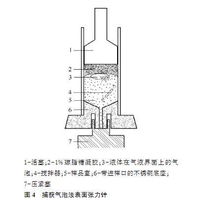 為了避免膜泄漏的出現(xiàn),Schürch等引入了一種防泄漏的捕獲氣泡法表面張力計。在捕獲氣泡法裝置中(見圖4),待測液體充滿樣品室,樣品室頂部鍍有一親水性瓊脂糖凝膠,從底部進樣口引入的氣泡在浮力作用下上升并緊靠瓊脂糖凝膠層,同時氣泡和凝膠層之間由于液體樣品薄層的阻隔,故不會黏附于凝膠層之上。氣泡的體積通過改變樣品室中的壓力來控制。隨著氣泡體積減小,表面積減小,氣泡表面張力下降。氣泡形狀隨表面張力的變化而變化,從球形到橢圓形。對于初始直徑大于5mm氣泡,當(dāng)表面張力趨于0時,氣泡呈薄圓盤狀。測量時,通過推動活塞改變樣品室的壓力來控制氣泡體積,并用視頻記錄氣泡體積變化。最后從視頻圖像中測得氣泡的高度和直徑,利用Malcolm等提出的方法計算氣液界面的表面張力、氣泡體積和表面積。