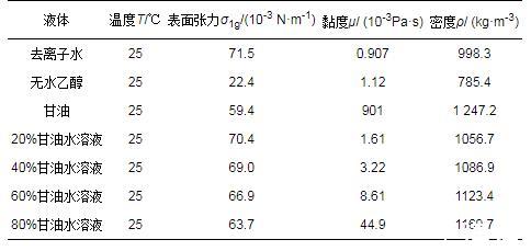 目前文獻(xiàn)中關(guān)于各類因素對(duì)液滴鋪展線速度和鋪展面積的影響,以及撞擊過程中液滴的表面能、動(dòng)能和黏性耗散的變化的研究較少,因此本文采用實(shí)驗(yàn)的方法研究了液滴的物性和操作條件對(duì)其撞擊固體表面過程中的鋪展直徑、鋪展速度和鋪展面積的影響,并結(jié)合能量法對(duì)表面能、動(dòng)能和黏性耗散在撞擊過程中的變化進(jìn)行分析,以揭示液滴撞擊固體表面過程的特點(diǎn)。