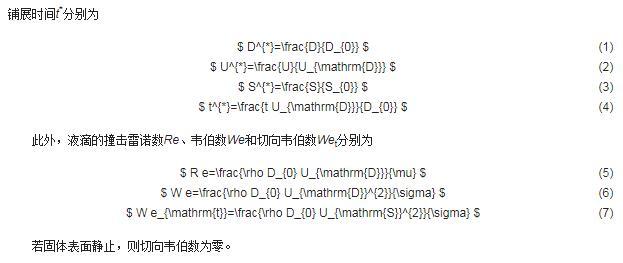 若一個具有初始球形當(dāng)量直徑D0以及初始面積S0的液滴在撞擊過程中經(jīng)過鋪展時間t后的鋪展直徑為D,鋪展面積為S,且此時鋪展線速度為U,則定義相應(yīng)的無量綱鋪展因子D*、無量綱鋪展速度U*、無量綱鋪展面積S*和無量綱鋪展時間t*分別為
