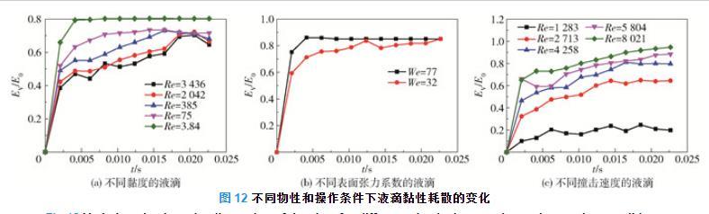 圖12(c)為液滴在不同撞擊速度下的黏性耗散情況。由圖5(b)可知,液滴的撞擊速度增加6.25倍時(shí),液滴的最大鋪展線速度增加3.14倍,液滴內(nèi)部的速度梯度增加,則根據(jù)式(22)可得液滴在撞擊過程中的黏性耗散率和黏性耗散速率均隨著撞擊速度的增大而增大。