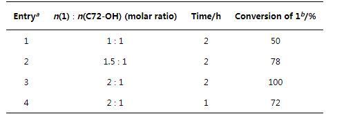 我們將原料1和C72-OH等物質(zhì)的量比混合,以超干四氫呋喃(THF)為溶劑,在0℃下進(jìn)行反應(yīng),2 h后通過(guò)核磁氫譜(1H NMR)觀測(cè)到有產(chǎn)物生成。但原料C72-OH的轉(zhuǎn)化率僅為50%(表1,Entry 1)。因此,我們對(duì)反應(yīng)物的比例、反應(yīng)時(shí)間做進(jìn)一步優(yōu)化。結(jié)果顯示:在原料1與原料C72-OH物質(zhì)的量比為2∶1,反應(yīng)時(shí)間為2 h的條件下,原料C72-OH可完全轉(zhuǎn)化(表1,Entry 3)。接下來(lái),我們將中間體C72-P與3 equiv.三甲胺(2 mol/L in THF)溶解在乙腈中,在70℃下反應(yīng)48 h,高產(chǎn)率得到目標(biāo)產(chǎn)物C72-MPB.用類(lèi)似方法合成了結(jié)構(gòu)相似的氟碳表面活性劑6:2-MPB(表2),并對(duì)比了C72-MPB與6:2-MPB的表面活性性能。