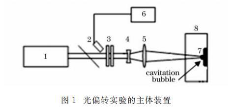 實(shí)驗(yàn)裝置的主體部分如圖1所示,脈沖Nd∶YAG激光1(波長(zhǎng)1.06μm,脈寬10ns,最大激光能量500mJ)經(jīng)過分光鏡2,衰減片3和擴(kuò)束裝置4,由會(huì)聚透鏡5(焦距150mm)聚焦于銅靶7上。水槽8里裝有具有不同表面張力的液體。能量計(jì)6用來實(shí)時(shí)監(jiān)測(cè)入射激光的能量。實(shí)驗(yàn)中靶面焦斑半徑為50μm.