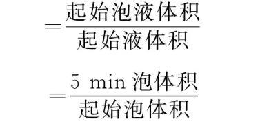泡沫性能:用振蕩法測(cè)定,即室溫(25℃)下,在100 mL具塞量筒中加入30 mL質(zhì)量分?jǐn)?shù)為0.5%或0.1%的待測(cè)溶液,用力振蕩10次,記錄泡沫和液體的總體積。靜置5 min,記錄泡沫體積。發(fā)泡力和穩(wěn)泡性計(jì)算公式: