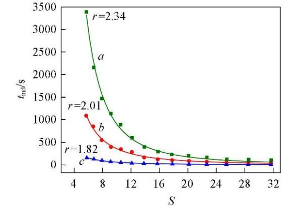 將圖1與圖4對比可知,添加NaCl后Li2CO3的成核誘導期明顯增長,說明體系中過量Cl?的存在抑制了Li2CO3的成核.用圖4中的實驗數據回歸了式(8)中的參數數值,結果列于表3.由回歸的參數數值可知,過飽和度對誘導期的影響仍然是在較低的溫度下更為顯著.