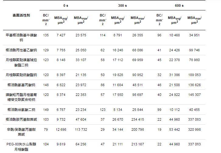 表3不同表面活性劑的泡沫在0,300和600 s時的氣泡面積