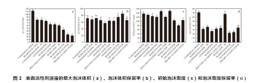 圖2表面活性劑溶液的最大泡沫體積(a)、泡沫體積保留率(b)、初始泡沫密度(c)和泡沫密度保留率(d)