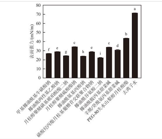 將10種表面活性劑的去離子水溶液(pH=6.0)進行表面張力測定,結(jié)果如圖1所示。去離子水的表面張力為71.81 mN/m;所有表面活性劑均可顯著降低去離子水的表面張力,其中PEG-80失水山梨醇月桂酸酯降低表面張力的能力最差,為43.73 mN/m;月桂醇聚醚硫酸酯鈉和椰油酰胺丙基甜菜堿水溶液的表面張力無顯著差異,分別為34.14和33.87 mN/m;辛酰/癸酰氨丙基甜菜堿水溶液的表面張力為30.54 mN/m;椰油酰兩性基乙酸鈉和磺酸羥丙酯月桂基葡糖苷交聯(lián)聚合物鈉水溶液的表面張力無顯著差異,分別為28.88和28.71 mN/m;甲基椰油酰基牛磺酸鈉水溶液的表面張力為26.74 mN/m;月桂醇聚醚磺基琥珀酸酯二鈉水溶液的表面張力為24.16 mN/m;椰油酰氨基丙酸鈉水溶液的表面張力較低,為23.84 mN/m;椰油酰谷氨酸二鈉水溶液的表面張力最低,為22.08 mN/m。
