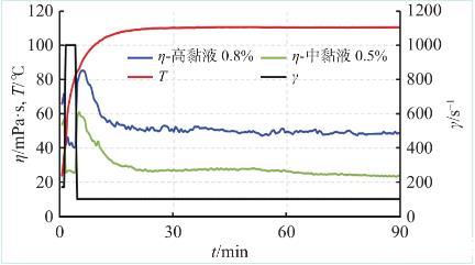 圖5不同配方壓裂液耐溫耐剪切測試曲線(110℃)