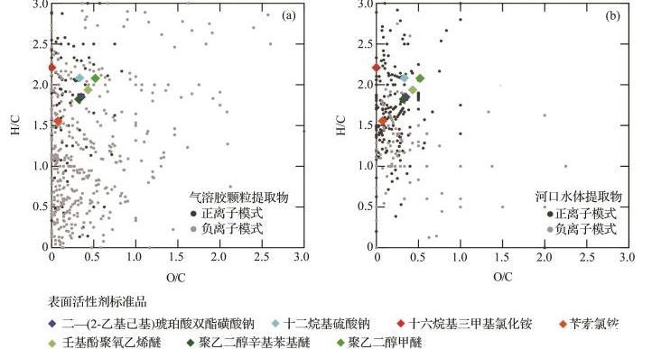 圖1氣溶膠顆粒(a)和河口水體(b)表面活性劑類(lèi)有機(jī)物的Van Krevelen圖