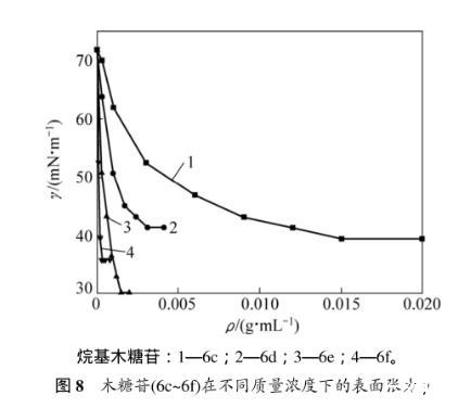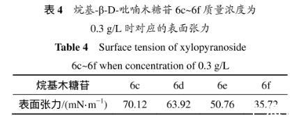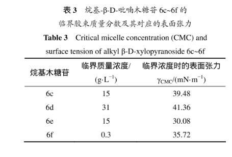 表3所示為烷基-β-D-吡喃木糖苷6c~6f的臨界質(zhì)量分?jǐn)?shù)及所對應(yīng)的表面張力。溶液表面的吸附量達(dá)到飽和時(剛好飽和時的濃度即為臨界濃度),表面張力最小。從表3可以看出:辛基-β-D-吡喃木糖苷(6e)達(dá)到臨界濃度時對應(yīng)的表面張力是最低的,能力最強(qiáng)。因為烷基木糖苷的表面活性是由其親水糖基和疏水烷基鏈共同決定,當(dāng)烷基鏈長為=8(糖苷6e)時,親水性和疏水性達(dá)到最佳平衡,表面張力最低。