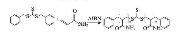 在500 mL四口燒瓶中加入200 g無水乙醇、10 g(0.14 mol)AM和一定量DBTTC〔其中,n(AM)∶n(DBTTC)=100∶1、200∶1、300∶1、500∶1、700∶1、1000∶1〕,超聲混合均勻后再加入0.0231 g(0.14 mmol)AIBN,然后在70℃下反應8 h。反應結(jié)束后,趁熱出料,過濾。在超聲條件下,用正己烷洗滌沉淀,過濾,重復數(shù)次,除去未反應完全的反應物,在45℃下真空干燥24 h,得到淡黃色的PAM-CTA固體粉末。將上述不同n(AM)∶n(DBTTC)制得的產(chǎn)物依次命名為PAM-CTA-1、PAM-CTA-2、PAM-CTA-3、PAM-CTA-4、PAM-CTA-5、PAM-CTA-6。