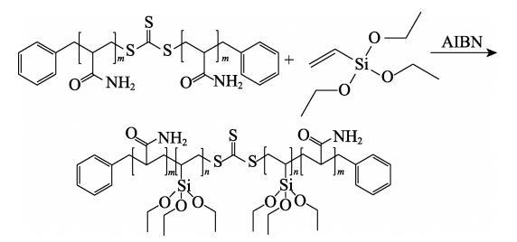 在500 mL四口燒瓶中加入300 g無水乙醇、0.0231 g(0.14 mmol)AIBN和10.0816 g(0.28 mmol)PAM-CTA-4,用超聲波將PAM-CTA-4混合均勻分散,再加入VTES〔其中,n(VTES)∶n(AM)=5∶100、10∶100、15∶100、20∶100〕,在70℃下反應8 h。反應結(jié)束后趁熱出料,過濾。在超聲條件下,用正己烷洗滌沉淀,過濾,重復數(shù)次,在45℃真空干燥24 h,得到PAM-b-PVTES固體粉末。將上述不同n(VTES)∶n(AM)制得的產(chǎn)物依次命名為PAM-b-PVTES-1、PAM-b-PVTES-2、PAM-b-PVTES-3、PAM-b-PVTES-4。