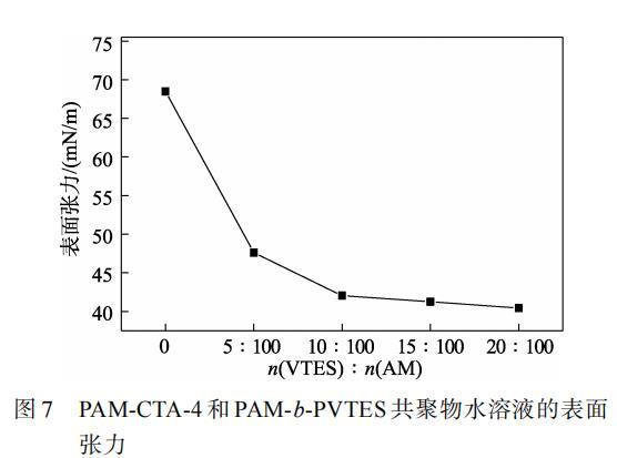 從圖7可以看出,隨著VTES用量的增大,共聚物水溶液的表面張力逐漸降低,n(VTES)∶n(AM)由0增加到10∶100時,共聚物水溶液表面張力從68.49 mN/m降低到40.44 mN/m,繼續增大VTES用量,共聚物水溶液表面張力逐漸趨于穩定。這說明VTES和AM共聚后賦予了共聚物水溶液更低的表面能,降低了共聚物水溶液的表面張力。
