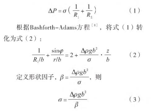 座滴法是基于熔體(液體)在水平托板表面形成穩(wěn)定橢球液滴的形狀參數(shù)測(cè)量表面張力的方法[6]。基于座滴法測(cè)量玻璃熔體表面張力,玻璃熔體在水平托板上受重力和表面張力共同作用形成旋轉(zhuǎn)軸對(duì)稱橢球[7](圖1),橢球表面任一點(diǎn)的壓力差與表面張力之間的數(shù)學(xué)關(guān)系見式(1):