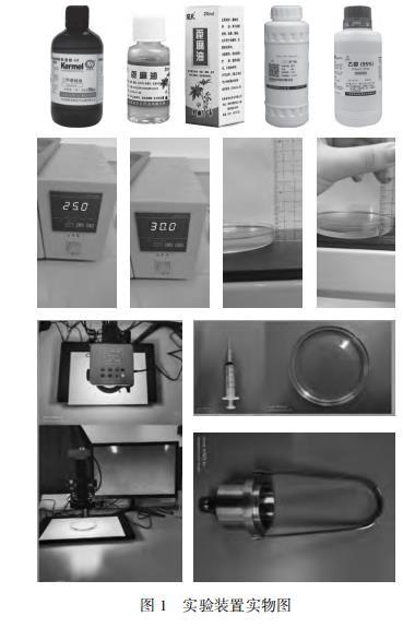 為了還原物理現(xiàn)象,初步探究液滴爆炸的原因,本文首先進(jìn)行了預(yù)實(shí)驗(yàn)。實(shí)驗(yàn)中所用到的物品包括:醫(yī)用75%酒精和蒸餾水混合形成水混合物液滴,家用菜籽油用作油池,普通藍(lán)墨水染色。在室溫環(huán)境下進(jìn)行實(shí)驗(yàn),預(yù)實(shí)驗(yàn)中發(fā)現(xiàn)普通藍(lán)墨水染色現(xiàn)象不明顯,改進(jìn)為采用甲基藍(lán)染色劑進(jìn)行染色。正式實(shí)驗(yàn)時(shí)準(zhǔn)備了不同種類的水混合物(乙醇、二乙二醇丁醚),不同種類的疏水性物質(zhì)(硅油、花生油、蓖麻油),不同厚度的疏水性物質(zhì)(5 mm、10 mm),設(shè)置合適的濃度梯度,采用恒溫水浴鍋來測(cè)定溫度。在顯微鏡下觀察液滴的運(yùn)動(dòng)過程,精準(zhǔn)測(cè)定液滴大小,利用注射器定量控制滴入液滴的體積,再利用黏度計(jì)測(cè)量黏性系數(shù),并對(duì)實(shí)驗(yàn)誤差進(jìn)行了修正。