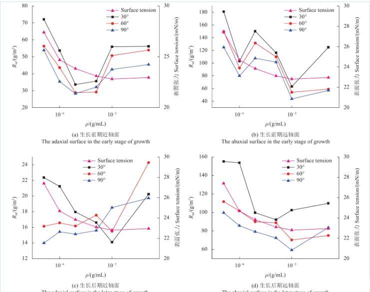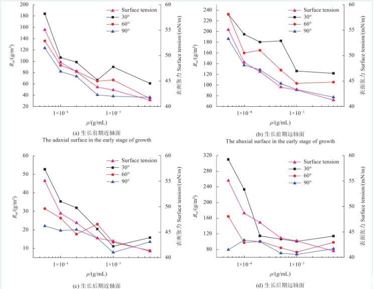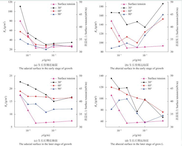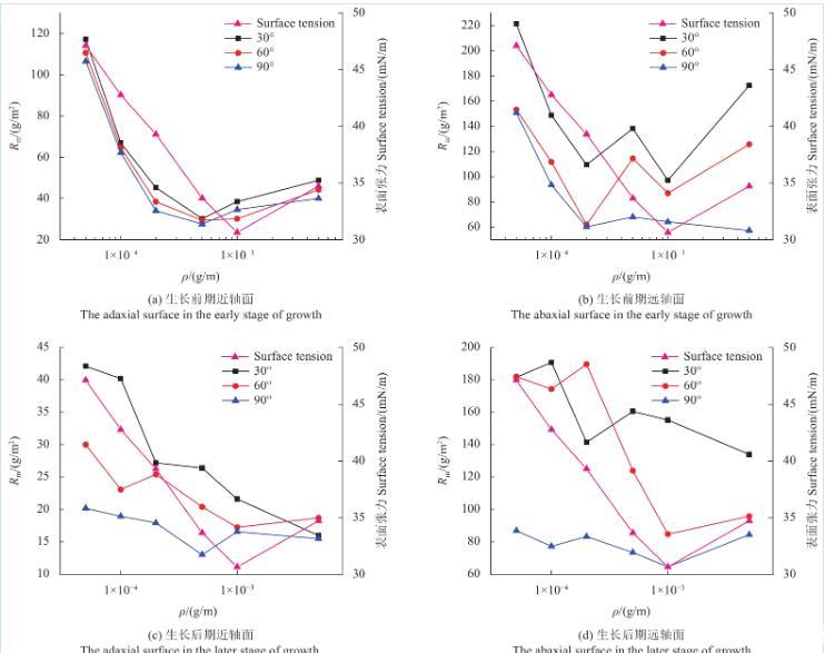 圖6為不同濃度SilwetL-77溶液在蘋果葉片近、遠軸面的Rm變化規(guī)律。由圖可知,當(dāng)溶液質(zhì)量濃度低于cmc時,蘋果葉片生長前、后期遠軸面的Rm值和表面張力均隨溶液質(zhì)量濃度的降低而減小。此外,蘋果葉片生長后期近軸面只有在30°傾角時的Rm值與表面張力隨溶液質(zhì)量濃度的提高而減小,60°傾角和90°傾角時Rm值隨溶液濃度變化不大。蘋果葉片生長后期遠軸面Rm值和表面張力隨溶液濃度的變化與生長前期基本一致。
