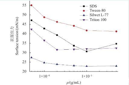 圖2 4種供試表面活性劑表面張力隨其質(zhì)量濃度變化的趨勢