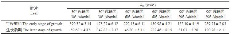 以上結(jié)果表明,蘋果葉片生長前期近軸面的Rm值高于生長后期,且在同一生長期,蘋果葉片遠軸面的Rm值遠高于近軸面。此外,蘋果葉片的Rm值隨葉傾角的增大而減小。