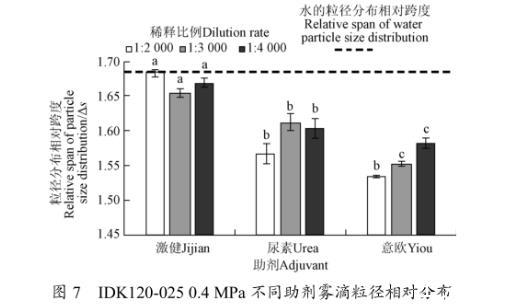 3)IDK120-025型噴頭,0.4 MPa壓力下。激健在配比1:3 000條件下,相比于自來(lái)水霧滴體積中徑增大20.43%,霧滴粒徑相對(duì)分布跨度減小1.74%。尿素與意歐溶液在配比1:2 000條件下,相比于自來(lái)水霧滴體積中徑分別增大16.92%、11.10%,霧滴粒徑相對(duì)分布跨度分別減小6.92%、8.86%,在增大霧滴體積中徑的同時(shí)有效改善霧滴分布質(zhì)量,增大霧滴飄移可控性。