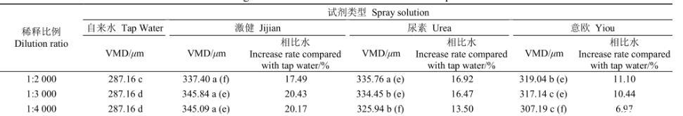 同一配比濃度下3種助劑溶液相比,激健溶液VMD最大,其次是尿素溶液。1:3 000配比時(shí)激健溶液相比于水將霧滴體積中徑增大20.43%,意歐溶液僅增大10.44%。尿素與意歐溶液在配比1:2 000時(shí)分別將粒徑增大16.92%、11.10%。
