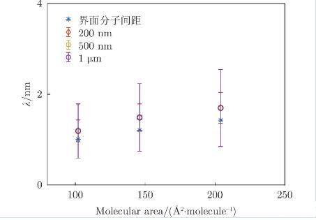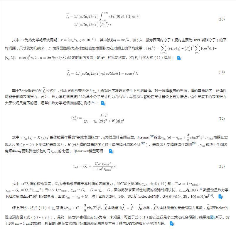 公式中,純水界面的表面張力為宏觀尺度準(zhǔn)靜態(tài)條件下的測量值。對于被膜覆蓋的界面,膜的彎曲剛度、黏彈性可能會影響表面張力。此外,熱力學(xué)毛細波波長為單個分子尺寸約為幾納米,與亞微米顆粒在尺寸量級上更為接近,這個尺度下的表面張力大于宏觀尺度下的值,通常由熱力學(xué)毛細波振幅測得: